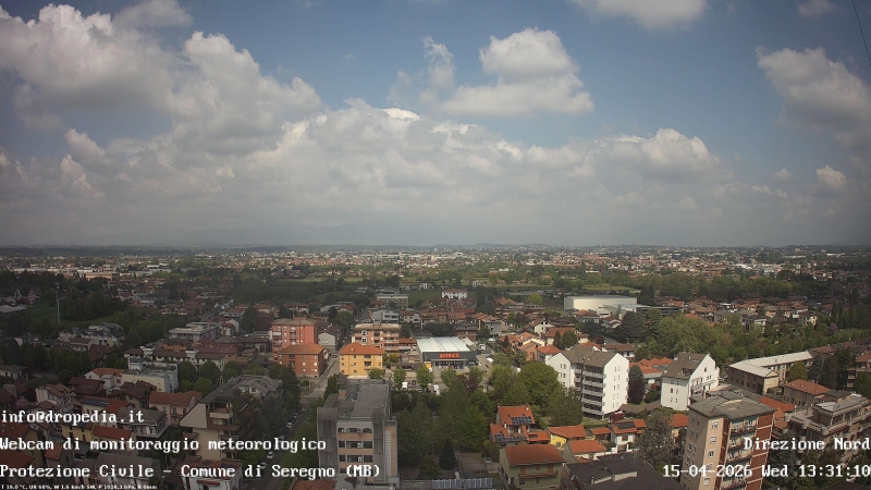 La webcam da Seregno (MB) nella giornata di mercoledi 15 aprile evidenzia il progressivo miglioramento delle condizioni meteorologiche dopo le piogge sparse dei giorni scorsi.