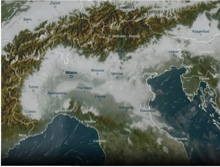 Domenica 12 ottobre: L'immagine dallo spazio denota la stratificazione e l'umidità presente soprattutto nei bassi strati un po' su tutto il nord Italia, chiaro segnale d'invecchiamento anticiclonico. Ringraziamo Fabio Porro per la segnalazione