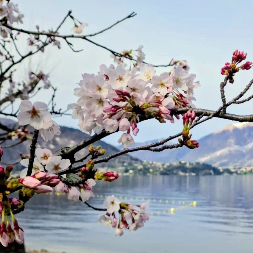 Domenica 22 marzo: la primavera si fa largo tra la vegetazione con molti alberi che iniziano il ciclo vegetativo estivo dopo la pausa invernale, in foto un ciliegio sulle sponde del lago di Como a Lierna (Lc). Foto by Mary Zucchi.