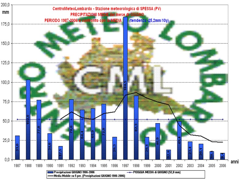 | Giugno 2006 è caratterizzato da scarse precipitazioni con distribuzione molto irregolare sull’intero territorio lombardo. La fascia alpina e prealpina è stata bagnata anche da temporali di calore, generati da locali infiltrazioni di aria fresca dai quadranti settentrionali e ciò ha contribuito a ridurre il deficit idrico mensile molto pesante su gran parte della regione. ** 1ª Decade** La presenza di un HP sul N-Europa lascia aperta la porta alla discesa di impulsi freschi dal Baltico e dalla Mittel-Europa verso la regione Padano-alpina e l’Adriatico. Ne consegue il transito di deboli linee d’instabilità sulla regione lombarda -- con fenomeni che colpiscono a macchia di leopardo. Rovesci o brevi temporali fanno la loro comparsa qua e là quasi a cadenza quotidiana, mentre gli episodi temporaleschi principali (accompagnati da grandine) si registrano durante la serata del g.5 su Bresciano e Mantovano (40mm nell’area urbana di Brescia ed oltre 20mm a Mantova) e nella serata del g.6 su Milanese, Pavese e di nuovo sul Bresciano (25mm a Corsico-MI, 18mm a Voghera-PV e Brescia). **2ª Decade** L’HP si afferma progressivamente sulla regione alpina, mentre si spegne l’instabilità residua, legata allo scorrimento fresco da NE. La decade trascorre poi con condizioni decisamente secche grazie al dominio dell’anticiclone africano. Le uniche precipitazioni hanno carattere molto locale e si generano soprattutto a causa dello spostamento dell’asse del promontorio dell’HP sub-tropicale ad Est dell’Italia con progressiva umidificazione sul Mediterraneo del flusso di correnti S-Occidentali, risalenti verso la regione alpina. **3ª Decade** La decade è ancora caratterizzata dal dominio dell’HP sub-tropicale che, però, presenta due in due fasi un lieve cedimento sulla regione Padano-alpina. Qualche temporale di calore scoppia lungo il settore montano (Orobie, Valtellina, Alto Bresciano) nei gg.22-23 con il passaggio della parte caudale dei sistemi nuvolosi oceanici su Svizzera ed Austria. Un prima onda ciclonica attenuata sopraggiunge nella serata del g.24 e mantiene instabilità anche nella giornata successiva. I fenomeni coinvolgono tutta la regione, ma le prp più abbondanti si hanno a Bellizona-(CH) 30mm, in Lomellina/Alessandrino (15-30mm tra Ottobiano, Pieve del Cairo e Pontecurone) ed il g.25 su Valtellina e fascia prealpina con 10-20mm. Il ritorno dell’HP non riesce ad impedire nuovi forti scrosci temporaleschi nei gg. 26-28 dapprima solo su Ticino e Alto Varesotto (nubifragio con grandine nel Luganese à picco di 71mm a Massagno) e successivamente lungo tutta la fascia montana e pedemontana. Col g.29 sopraggiunge il secondo cavo d’onda con nuovi episodi temporaleschi diffusi più intensi su Bresciano e Lombardia Est a causa dell’ingresso mattutino del nucleo freddo in quota. ** Le serie storiche relative alle precipitazioni di Giugno in tre stazioni lombarde: 1) La stazione di Varese-CGP ha fatto registrare un accumulo mensile di pioggia pari a 12,3mm contro una media sull’intera serie storica (1965-2006) di 141,5mm (bilancio -129,2mm à 9% della prp media mensile). Segnaliamo subito che il mese di Giugno del 2006 per Varese risulta essere il più secco di tutta la serie storica. Le precipitazioni mensili mostrano una tendenza alla diminuzione. Statisticamente si evidenzia una riduzione pari a -4,4mm ogni 10 anni. Questa tendenza è solo in parte significativa ed, infatti, come evidenziato dalla media mobile su base 5 -- linea nera in grassetto -- la piovosità denota un andamento oscillante attorno al valore medio mensile. Da rimarcare, però, la forte riduzione delle precipitazioni in Giugno a partire dall’anno 2000 con nessun valore sopra media. Tale periodo comprende altresì i due picchi minimi di precipitazione per Giugno: il 2006 ed il 2004. Dal tracciato si scorge una periodicità delle precipitazioni all’incirca undecennale molto probabilmente ricollegabile alle variazioni dell’attività solare. Se analizziamo la serie storica in base ad una distribuzione logaritmica dei valori, riscontriamo che solo due dati possiedono un tempo di ritorno ragguardevole: Il Giugno più piovoso 343,4mm nel 1992 à tempo di ritorno 200-250 anni Il 2°Giugno più piovoso 304,6mm nel 1997 à tempo di ritorno 150 anni Ricordiamo che la piovosità delle annate, in cui si sono accumulati 250-300mm, risulta avere un tempo di ritorno tra 75-125anni. 2) La stazione di Milano-S.Leonardo ha fatto registrare un accumulo mensile di pioggia pari a 32,3mm contro una media sull’intera serie storica (1979-2006) di 74,2mm (bilancio –41,9mm à 43% della prp media mensile). Le precipitazioni mensili mostrano una lieve tendenza alla riduzione. Statisticamente si evidenzia un calo di -2,9mm ogni 10 anni. Questa tendenza, come per Varese, non è in alcun modo significativa dal punto di vista statistico. Ciò è evidenziato molto chiaramente dalla media mobile su base 5 -- linea nera in grassetto -- che presenta un andamento irregolare attorno ai valori medi con un picco alla fine degli anni 90, generato dalla forte piovisità del 1997. Anche per Milano si intravede una periodicità all’incirca undecennale, benchè tale riscontro diventi più labile in questo inizio del XXI secolo. Se analizziamo la serie storica in base ad una distribuzione logaritmica dei valori, riscontriamo che solo due dati hanno una buona significatività dal punto di vista del tempo di ritorno. Il Giugno più piovoso 230,8mm nel 1997 à tempo di ritorno 325-350 anni Il 2°Giugno più piovoso 162,2mm nel 1988 à tempo di ritorno 75 anni La piovosità del Maggio 1996 con oltre 130mm ha un tempo di ritorno di soli 40anni. 3) La stazione di Spessa (PV) ha fatto registrare un accumulo mensile pari a 8,4mm contro una media sull’intera serie storica (1987-2006) di 52,0mm (bilancio -43,6mm = 16% della prp media mensile). Segnaliamo subito che il mese di Maggio del 2006 per Spessa risulta essere il più secco di t