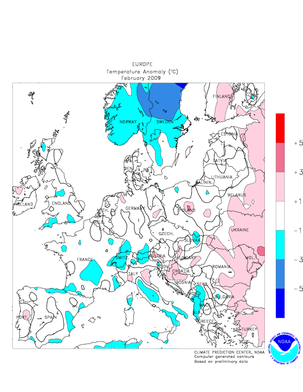 Dal punto di vista termico abbiamo registrato 12gg. con valori massimi al di sopra dei 10°C ed 1gg con valori massimi superiori a 15°C. Normalmente a Milano-S.Leonardo (1984-2008) si ha una media di 12±7gg con massime superiori a 10°C e 2±3gg di con valori superiori a 15°C. Abbiamo avuto anche 12gg. di gelo, cioè con valori minimi uguali o inferiori a 0°C, contro una media di 14±6gg. Da queste brevi note statistiche risulta evidente come dal punto di vista termico il mese di Febbraio risulti rispettare la normalità in tutto e per tutto. Fig.1 anomalia della temperatura a livello del suolo per il mese di FEBBRAIO rispetto alla media climatica 1968-1997 - elaborazione CPC-NOAA ---1---