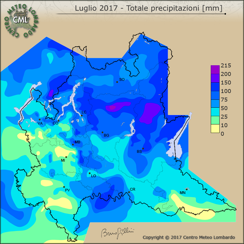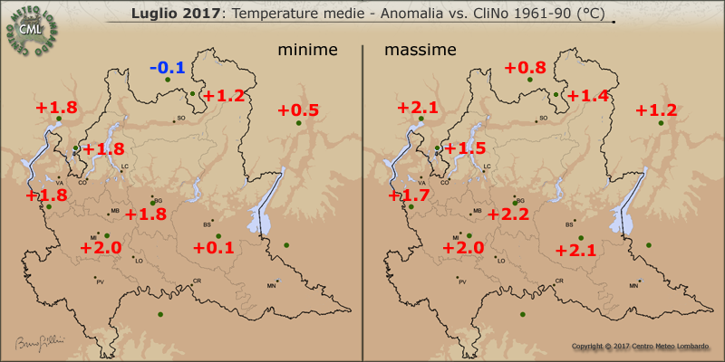 | CALDO E QUALCHE TEMPORALE Luglio 2017 è risultato un mese prettamente estivo, con temperature calde (temporaneamente molto calde) e tipicamente estive per tutto il mese; le precipitazioni sono avvenute esclusivamente sotto forma di rovescio e temporale. L’alta pressione delle Azzorre quindi, talvolta alimentata da contributi africani, ha impedito per tutto il mese ai fronti perturbati atlantici organizzati di scendere di latitudine e di transitare sul nostro territorio. A livello pluviometrico, il mese ha visto precipitazioni disomogenee ed irregolari, dato che sono avvenute sotto forma di rovescio e temporale; gli accumuli mensili non sono comunque risultati particolarmente significativi, ed in talune zone sono anzi risultati scarsi. A livello termico, si sono registrati valori di temperature superiori alle medie del periodo. Eloquente in tal senso il grafico sottostante, che evidenzia gli scambi di calore in bassa troposfera (ad 850 hpa), e che mostra uno scarto medio mensile (rispetto al trentennio 1981/2010) di +1,0 °C. Più in dettaglio, il mese inizia con la nostra regione abbracciata dall’anticiclone azzorriano che ci ha garantito un clima piacevole, con notti asciutte e ventilate e giornate calde ma sopportabili. Nella seconda parte della decade, caldo in aumento a seguito di una bassa pressione presente sul Portogallo che ha alimentato un contributo africano fin sulla Lombardia, con temperature e umidità in netto aumento e, di fatto, l’ondata di caldo più significativa di tutto il mese (in bassa troposfera, a 850 hpa, si sono toccati i 22 °, con uno scarto di oltre 8 °C sulle medie del periodo). La seconda decade mostra due fasi piuttosto distinte; nella prima parte infatti l’inserimento di correnti più fresche in quota, legate ad un flusso di correnti umide atlantiche occidentali lambisce la nostra regione, determinando condizioni di tempo variabile con temporali sui rilievi, e localmente anche su alcune aree di pianura, in un quadro termico caldo ma in media per il periodo. La seconda parte della decade vede nuovamente l’espansione verso est dell’anticiclone delle Azzorre associata all’estensione verso nord dell’alta pressione in quota dal nord Africa; quadro sinottico che favorisce bel tempo e caldo estivo, con solo occasionali e circoscritti rovesci e temporali pomeridiani sui rilievi. La terza decade trascorre col nostro territorio al limite tra una solida campana anticiclonica e un flusso in quota dai quadranti occidentali; flusso associato ad una vasta area depressionaria presente su buona parte dell'Europa centro-settentrionale (con perno tra le Isole Britanniche e la Francia); quadro barico che favorisce sulla Lombardia un tipo di tempo estivo nelle temperature, con però alcuni rovesci o temporali nel pomeriggio/sera sui rilievi che, di tanto in tanto, sconfinano su alcune zone di pianura. In particolare, i giorni 24 e 29, in un contesto di clima estivo, la coda di fronti organizzati in passaggio a nord delle Alpi ha permesso lo sviluppo di