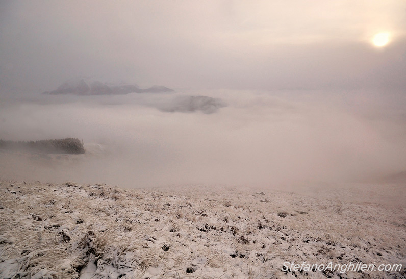 | Finalmente la luce del Sole diretta! In quel momento solo la natura avrebbe potuto dire quanto meraviglioso sarebbe stato lo spettacolo dei pochi (6) minuti successivi! | | Il colore del Sole mutò velocemente, passando da arancione a fucsia! I colori erano saturi e incredibili perché le precipitazioni erano cessate da pochissimo e l’umidità nell’aria li rendeva ancora più vividi. |   | Come spesso accade, appena dopo il tramonto, il tappeto di nubi, non ricevendo più alcuna energia dal Sole, scese di quota, in questo caso spinto ulteriormente verso il basso dalla brezza Nord-occidentale sempre più convinta. | | Concludendo, non sempre solo le situazioni meteorologicamente più emozionanti possono poi tradursi in qualcosa di interessante da fotografare, anzi, la maggior parte delle volte non è così. Molte volte bisogna saper trovare il bello letteralmente sopra le nuvole e andarselo a prendere anche quando tutto sembra grigio sulla base delle conoscenze di meteorologia "pratica" che uno possiede. |